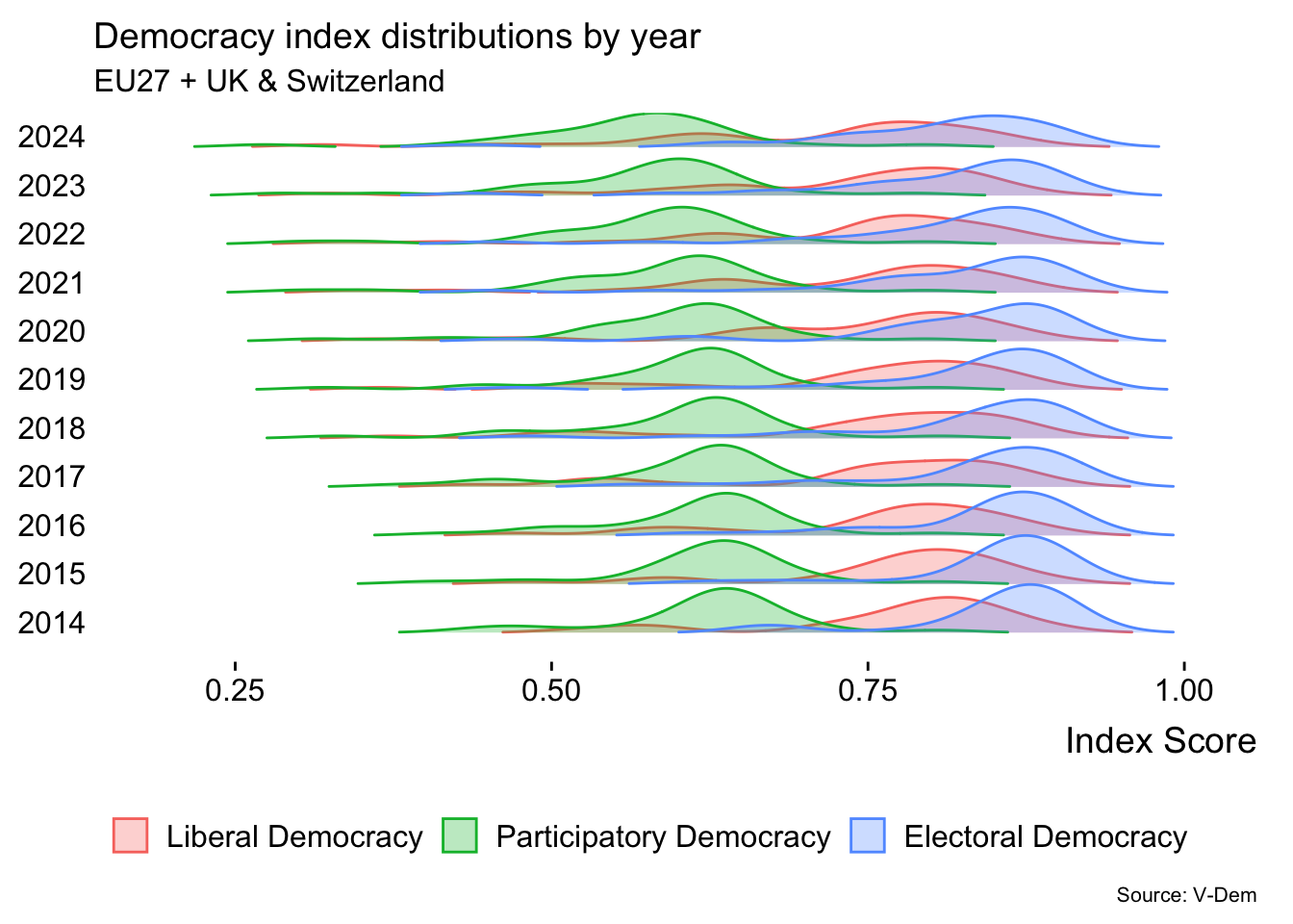library(ggplot2)library(dplyr)library(tidyr)library(vdemdata)library(ggridges)library(forcats)# get v-dem data, define country listdf <- vdemdata::vdemEU27_List_UK_CH <-c("Austria","Belgium","Bulgaria","Croatia","Cyprus","Czechia","Denmark","Estonia","Finland", "France","Germany","Greece","Hungary","Italy", "Ireland", "Latvia", "Lithuania","Luxembourg","Malta","Netherlands", "Poland", "Portugal", "Romania","Slovenia", "Slovakia","Spain","Sweden","Switzerland", "United Kingdom")EU_Dem <- df |>filter(country_name %in% EU27_List_UK_CH, year >=1989)|>select(country_name, year, v2x_polyarchy, v2x_libdem, v2x_partipdem, v2x_delibdem, v2x_egaldem)# pivot long (for later)EU_Dem_long <- EU_Dem |>pivot_longer(cols =c(v2x_polyarchy, v2x_libdem, v2x_partipdem, v2x_delibdem, v2x_egaldem),names_to ="index_type",values_to ="score")EU_Dem_long <- EU_Dem_long |>mutate(index_type =recode(index_type,"v2x_polyarchy"="Electoral Democracy","v2x_libdem"="Liberal Democracy","v2x_partipdem"="Participatory Democracy","v2x_delibdem"="Deliberative Democracy","v2x_egaldem"="Egalitarian Democracy" ))#Select indicators and yearsSELECTED_INDICATORS <-c("v2x_polyarchy", "v2x_libdem", "v2x_partipdem")SELECTED_YEARS <-c(2014, 2015, 2016, 2017, 2018, 2019, 2020, 2021, 2022, 2023, 2024)#Filter the EU data for the selected yearsEU_Dem_Filtered <- EU_Dem |>filter(year %in% SELECTED_YEARS)#Pivot long for ridgelineEU_Dem_Super_Long <- EU_Dem_Filtered |>pivot_longer(cols =all_of(SELECTED_INDICATORS),names_to ="Index_Name", values_to ="Index_Score" ) |>#Create a combined factor for the Y-axis (e.g., "v2x_polyarchy - 2024")mutate(Y_Axis_Group =factor(paste0(Index_Name, " - ", year),#Order the factor levels for better plotting order (e.g., by year then index)levels =unique(paste0(Index_Name, " - ", sort(year))) ))index_labels <-c("v2x_polyarchy"="Electoral Democracy","v2x_libdem"="Liberal Democracy","v2x_partipdem"="Participatory Democracy")ggplot(EU_Dem_Super_Long, aes(x = Index_Score, y =as.factor(year), fill = Index_Name,color = Index_Name,group =interaction(year, Index_Name) )) +geom_density_ridges(alpha =0.3, scale =1.0,rel_min_height =0.01 ) +scale_fill_discrete(labels = index_labels) +scale_color_discrete(labels = index_labels) +labs(title ="Democracy index distributions by year",subtitle ="EU27 + UK & Switzerland",x ="Index Score",y =NULL, fill =NULL,color =NULL,caption ="Source: V-Dem" ) +theme_ridges(grid =FALSE) +theme(legend.position ="bottom",legend.direction ="horizontal",plot.title =element_text(face ="plain"),plot.caption =element_text(size =8) )