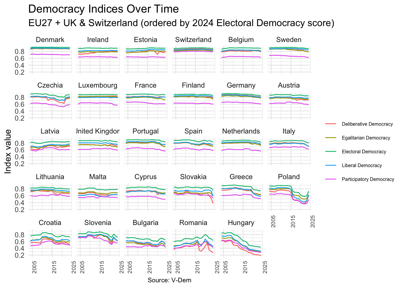 library(ggplot2)library(dplyr)library(tidyr)library(vdemdata)# Create country order based on 2024 polyarchy scorecountry_order <- EU_Dem |>filter(year ==2024) |>arrange(desc(v2x_polyarchy)) |>pull(country_name)EU_Dem_long <- EU_Dem |>filter(year >=2004) |>pivot_longer(cols =c(v2x_polyarchy, v2x_libdem, v2x_partipdem, v2x_delibdem, v2x_egaldem),names_to ="index_type",values_to ="score" ) |>mutate(index_type =recode(index_type,"v2x_polyarchy"="Electoral Democracy","v2x_libdem"="Liberal Democracy","v2x_partipdem"="Participatory Democracy","v2x_delibdem"="Deliberative Democracy","v2x_egaldem"="Egalitarian Democracy" ),country_name =factor(country_name, levels = country_order) )ggplot(EU_Dem_long, aes(x = year, y = score, color = index_type)) +geom_line() +facet_wrap(~country_name, scales ="fixed") +scale_x_continuous(breaks =c(2005, 2015, 2025)) +theme_minimal() +labs(x =NULL, y ="Index value", color =NULL,title ="Democracy Indices Over Time",subtitle ="EU27 + UK & Switzerland (ordered by 2024 Electoral Democracy score)",caption ="Source: V-Dem") +theme(legend.position ="right",legend.direction ="vertical",legend.text =element_text(size =6),axis.text.x =element_text(size =7, angle =90),plot.title =element_text(size =14),plot.subtitle =element_text(size =12),plot.caption =element_text(size =8, hjust =0.5) )