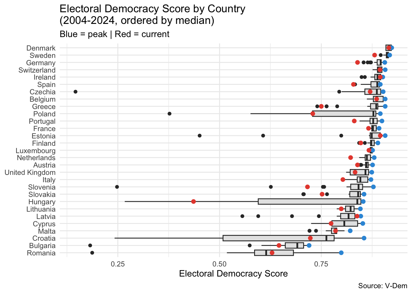 current_values <- EU_Dem |>group_by(country_name) |>filter(year ==max(year)) |>ungroup()peak_values <- EU_Dem |>group_by(country_name) |>filter(v2x_polyarchy ==max(v2x_polyarchy)) |>slice(1) |>ungroup()ggplot(EU_Dem, aes(x =reorder(country_name, v2x_polyarchy, median), y = v2x_polyarchy)) +geom_boxplot(fill ="grey90") +geom_point(data = peak_values,aes(x = country_name, y = v2x_polyarchy),color ="#3498DB", size =2) +geom_point(data = current_values,aes(x = country_name, y = v2x_polyarchy),color ="#E74C3C", size =2) +coord_flip() +theme_minimal() +labs(x =NULL, y ="Electoral Democracy Score",title ="Electoral Democracy Score by Country \n(2004-2024, ordered by median)",subtitle ="Blue = peak | Red = current",caption ="Source: V-Dem")