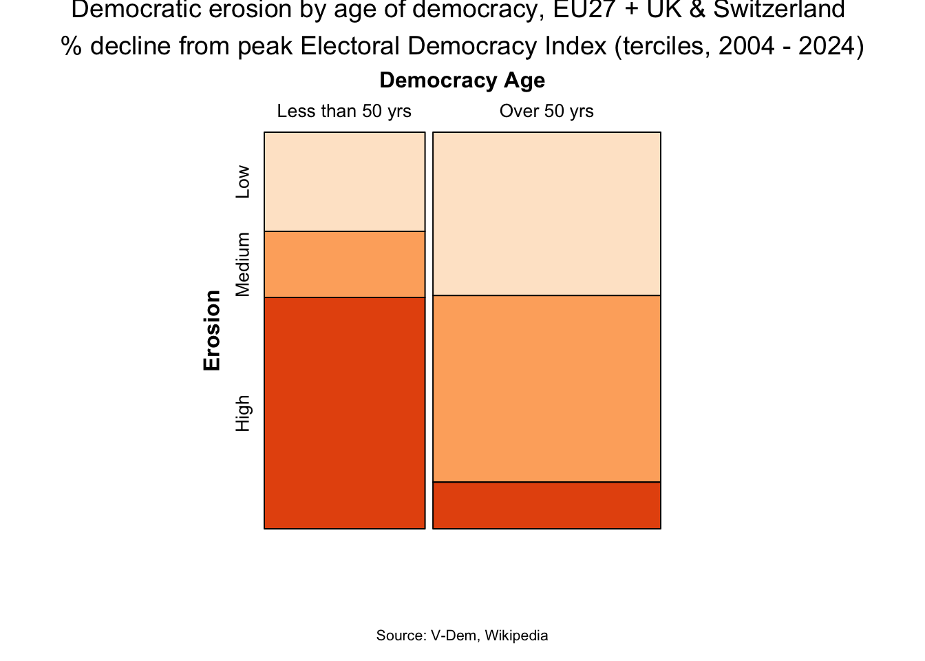 Age of democracy Democracies emerging from the iron curtain in 1989 seem most vulnerable to backsliding. The mosaic plot illustrating the association between age of democracy and the magnitude of democratic erosion appears to support this. One limitation: the democracy age variable captures the current continuous democratic period (typically starting on 1945-46 or 1989-91), which understates the democratic experience of countries with older parliamentary histories.