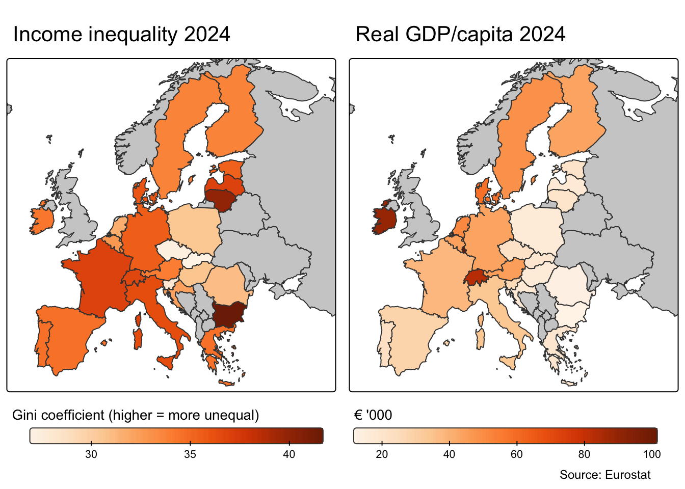 #install.packages("eurostat")library(eurostat)library(tidyverse)library(rnaturalearth)library(sf)library(tmap)# Get Eurostat data listing#toc <- get_eurostat_toc()# 1. Setup: country list and codesEU27_UK_CH <-c("Austria", "Belgium", "Bulgaria", "Croatia", "Cyprus", "Czechia", "Denmark", "Estonia", "Finland", "France", "Germany", "Greece", "Hungary", "Italy", "Ireland", "Latvia", "Lithuania", "Luxembourg", "Malta", "Netherlands", "Poland", "Portugal", "Romania", "Slovenia", "Slovakia", "Spain", "Sweden", "Switzerland", "United Kingdom")geo_codes <-get_eurostat_dic("geo") |>filter(full_name %in% EU27_UK_CH, nchar(code_name) ==2)eu_codes <- geo_codes$code_name# 2. Get Eurostat data (Gini and GDP per capita)gini_raw <-get_eurostat("ilc_di12c", time_format ="num",filters =list(geo = eu_codes, time =2004:2024))gdp_raw <-get_eurostat("sdg_08_10",time_format ="num",filters =list(geo = eu_codes, time =2004:2024, unit ="CLV20_EUR_HAB"))# 3. Get V-Dem polyarchypolyarchy <- df |>filter(country_name %in% EU27_UK_CH, year >=2004) |>select(country_name, year, v2x_polyarchy)# 4. Build main analysis dataframeinequal <- gini_raw |>left_join(geo_codes, by =c("geo"="code_name")) |>rename(country_name = full_name, year = time, gini = values) |>left_join(polyarchy, by =c("country_name", "year")) |>left_join(gdp_raw |>select(geo, time, gdp = values), by =c("geo", "year"="time")) |>group_by(country_name) |>arrange(year) |>mutate(peak_polyarchy =cummax(lag(v2x_polyarchy, default =first(v2x_polyarchy))),pct_change_from_peak = (v2x_polyarchy - peak_polyarchy) / peak_polyarchy *100,erosion =ifelse(pct_change_from_peak <=-30, 1, 0) ) |>ungroup()# 5. Map data (latest year per country)europe <-ne_countries(scale ="medium", continent ="Europe", returnclass ="sf")europe_data <- inequal |>group_by(country_name) |>filter(year ==max(year)) |>slice(1) |>ungroup() |>select(country_name, gini, gdp) |>right_join(europe, by =c("country_name"="name")) |>st_as_sf()# Set to plot modetmap_mode("plot")# Gini mapp1 <-tm_shape(europe_data, bbox =c(-10, 35, 40, 70)) +tm_polygons(fill ="gini", fill.scale =tm_scale_continuous(values ="oranges"),fill.legend =tm_legend(title ="Gini coefficient (higher = more unequal)", na.show =FALSE,orientation ="landscape",width =25,frame =FALSE )) +tm_title("Income inequality 2024") # GDP mapp2 <-tm_shape(europe_data, bbox =c(-10, 35, 40, 70)) +tm_polygons(fill ="gdp", fill.scale =tm_scale_continuous(values ="oranges",label.format =list(fun =function(x) paste0(round(x/1000)))),fill.legend =tm_legend(title ="€ '000", na.show =FALSE,orientation ="landscape",width =25,frame =FALSE), ) +tm_title("Real GDP/capita 2024")# Side by sidetmap_arrange(p1, p2)grid.text("Source: Eurostat", x =0.95, y =0.03, just ="right",gp =gpar(fontsize =9))