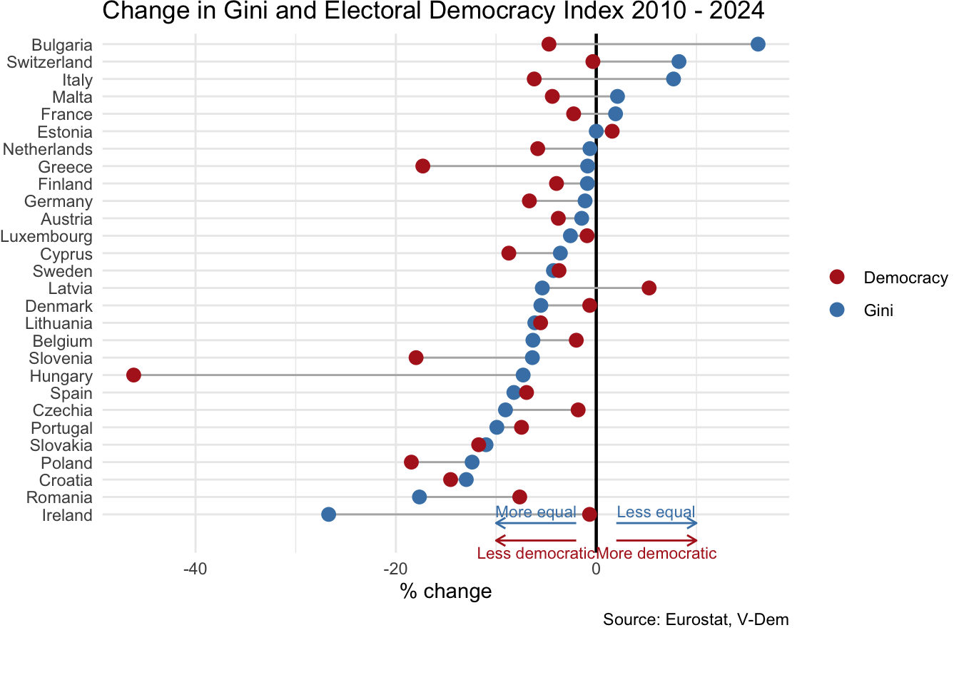 # Calculate % change for both metrics from inequalcleveland_data <- inequal |>filter(year %in%c(2010, 2024), country_name !="United Kingdom") |>group_by(country_name) |>summarise(gini_change = (gini[year ==2024] - gini[year ==2010]) / gini[year ==2010] *100,polyarchy_change = (v2x_polyarchy[year ==2024] - v2x_polyarchy[year ==2010]) / v2x_polyarchy[year ==2010] *100 ) |>drop_na()# Pivot for plottingcleveland_long <- cleveland_data |>pivot_longer(cols =c(gini_change, polyarchy_change),names_to ="metric",values_to ="pct_change") |>mutate(metric =ifelse(metric =="gini_change", "Gini", "Democracy"))# Cleveland dot plotggplot(cleveland_long, aes(x = pct_change, y =reorder(country_name, pct_change * (metric =="Gini")), colour = metric)) +geom_vline(xintercept =0, linewidth =0.8, colour ="black") +geom_line(aes(group = country_name), colour ="grey70") +geom_point(size =3) +scale_colour_manual(values =c("Gini"="steelblue", "Democracy"="firebrick")) +labs(x ="% change", y =NULL, colour =NULL,title ="Change in Gini and Electoral Democracy Index 2010 - 2024",caption ="Source: Eurostat, V-Dem") +theme_minimal() +theme(plot.title =element_text(size =14) ) +# Blue arrows for Giniannotate("segment", x =-2, xend =-10, y =0.5, yend =0.5, arrow =arrow(length =unit(0.2, "cm")), colour ="steelblue") +annotate("text", x =-6, y =1.2, label ="More equal", colour ="steelblue", size =3) +annotate("segment", x =2, xend =10, y =0.5, yend =0.5, arrow =arrow(length =unit(0.2, "cm")), colour ="steelblue") +annotate("text", x =6, y =1.2, label ="Less equal", colour ="steelblue", size =3) +# Red arrows for Democracyannotate("segment", x =-2, xend =-10, y =-0.5, yend =-0.5, arrow =arrow(length =unit(0.2, "cm")), colour ="firebrick") +annotate("text", x =-6, y =-1.2, label ="Less democratic", colour ="firebrick", size =3) +annotate("segment", x =2, xend =10, y =-0.5, yend =-0.5, arrow =arrow(length =unit(0.2, "cm")), colour ="firebrick") +annotate("text", x =6, y =-1.2, label ="More democratic", colour ="firebrick", size =3) +theme_minimal() +coord_cartesian(clip ="off") +theme(plot.margin =margin(b =30))