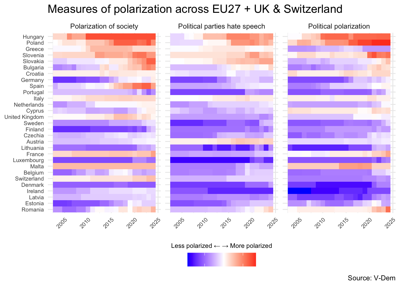 Causes: culture wars and disinformation Polarization has been frequently linked to democratic erosion. The heatmap reveals a clear pattern: countries ranking lowest on the Electoral Democracy Index (Hungary, Poland, Greece, Slovenia, Slovakia) show intensifying polarization across three different dimensions. These capture distinct but related phenomena: whether society is divided into antagonistic political camps (political polarization), whether major parties deploy hate speech in their rhetoric (political parties hate speech), and the extent to which differences of opinion result in major clashes of views (polarization of society). The visual evidence suggests that democratic backsliding and rising polarization tend to move together.