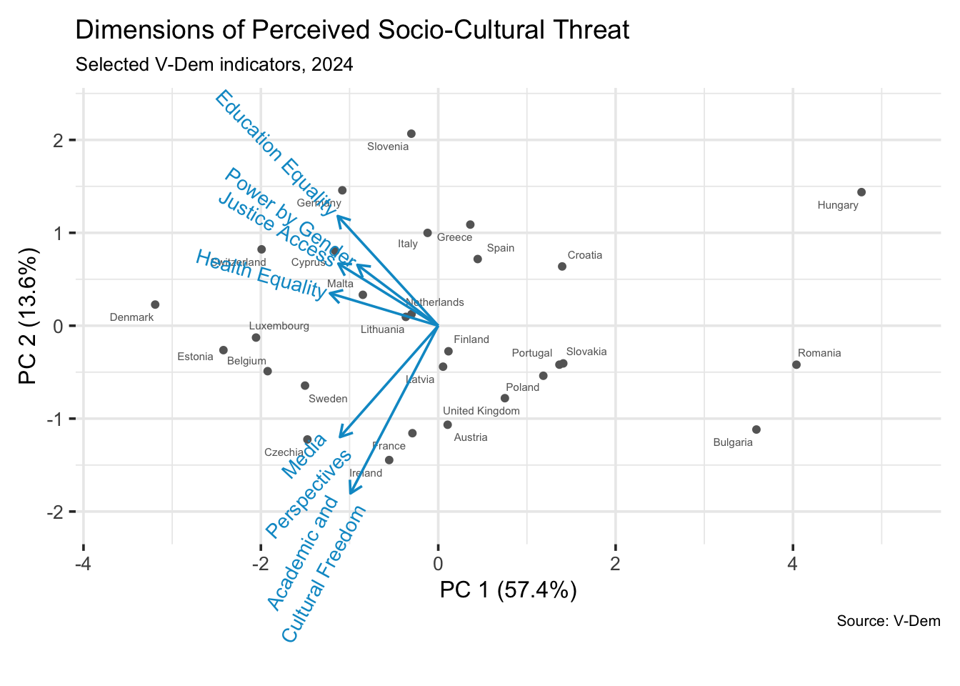Causes: Sociocultural threats Perceived socio-cultural threats - such as expanded equality across social groups and distrust towards pluralistic expression - have been proposed as drivers of democratic backsliding. The biplot maps six V-Dem indicators capturing both dimensions: educational equality, health equality, justice access, and power by gender on one hand; media perspectives and academic/cultural freedom on the other. PC1 (57.4% of variance) separates countries by overall performance: Hungary, Romania, and Bulgaria cluster on the far right, scoring weakly across all indicators. PC2 (13.6%) distinguishes between equality-focused democracies (upper left: Germany, Slovenia, Switzerland scoring higher on education, health, justice) and freedom of expression-focused ones (lower left: Czechia, Ireland, France scoring higher on media perspectives and academic freedom). The backsliding democracies cluster away from all vectors, suggesting erosion occurs across both dimensions simultaneously rather than selectively.