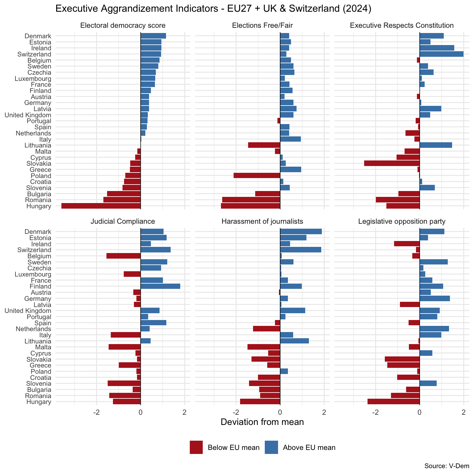 library(tidyverse)EU_aggrand_df <- df |>filter(country_name %in% EU27_List_UK_CH, year ==2024) |>select( country_name, year,"Electoral democracy score"= v2x_polyarchy,"Elections Free/Fair"= v2elfrfair,"Executive Respects Constitution"= v2exrescon,"Judicial Compliance"= v2jucomp,"Harassment of journalists"= v2meharjrn,"Legislative opposition party"= v2lgoppart )# Create long formatEU_aggrand_long <- EU_aggrand_df |>pivot_longer(cols =-c(country_name, year),names_to ="indicator",values_to ="value" )# Calculate deviation from median using z-scoresEU_diverging <- EU_aggrand_long |>group_by(indicator) |>mutate(deviation = (value -mean(value, na.rm =TRUE)) /sd(value, na.rm =TRUE) ) |>ungroup()# Create country order based on polyarchy scorecountry_order <- EU_aggrand_df |>arrange(`Electoral democracy score`) |>pull(country_name)EU_diverging <- EU_diverging |>mutate(country_name =factor(country_name, levels = country_order))# Set indicator order with polyarchy firstEU_diverging <- EU_diverging |>mutate(indicator =factor(indicator, levels =c("Electoral democracy score","Elections Free/Fair","Executive Respects Constitution","Judicial Compliance","Harassment of journalists","Legislative opposition party" )))ggplot(EU_diverging, aes(x = deviation, y = country_name, fill = deviation >0)) +geom_col() +facet_wrap(~indicator, ncol =3) +scale_fill_manual(values =c("firebrick", "steelblue"), labels =c("Below EU mean", "Above EU mean")) +geom_vline(xintercept =0, linewidth =0.3) +theme_minimal() +theme(plot.title =element_text(size =12),axis.text.y =element_text(size =8),legend.position ="bottom",legend.direction ="horizontal",plot.caption =element_text(hjust =1, size =8) ) +labs(x ="Deviation from mean", y =NULL, fill =NULL,title ="Executive Aggrandizement Indicators - EU27 + UK & Switzerland (2024)",caption ="Source: V-Dem" )